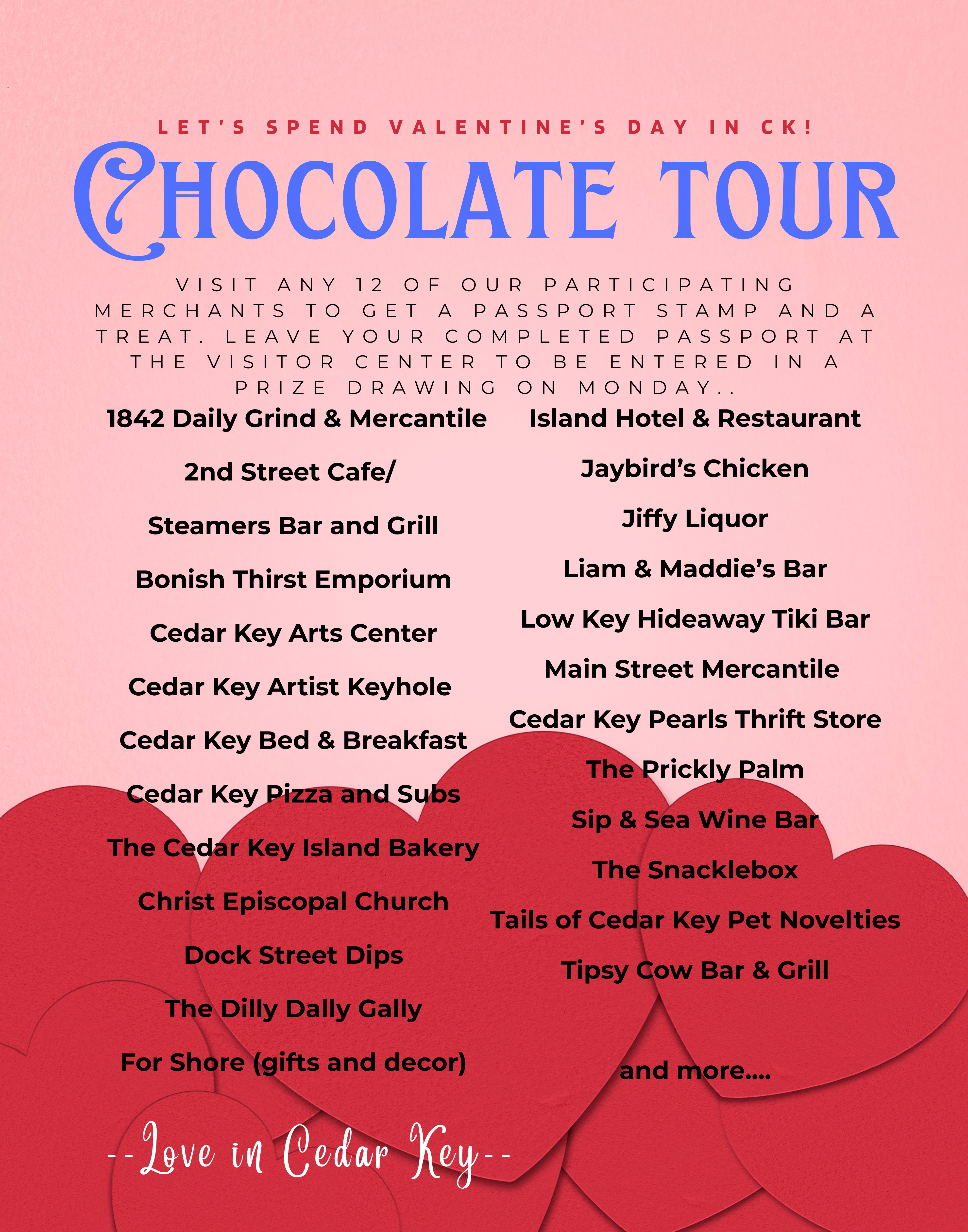 Love was in the air for Valentine’s Day in Cedar Key. Hundreds of people visited the island on Saturday, February 14, to celebrate the holiday and participate in the first “Chocolate Tour of Cedar Key.” This fun & free event was put on by Joetta Schneider, Jackie Kiss, and myself. We think Cedar Key is the perfect getaway for Valentine’s Day and wanted people to experience it in a fun and unique way. We were told every room in town was booked and businesses were busy!